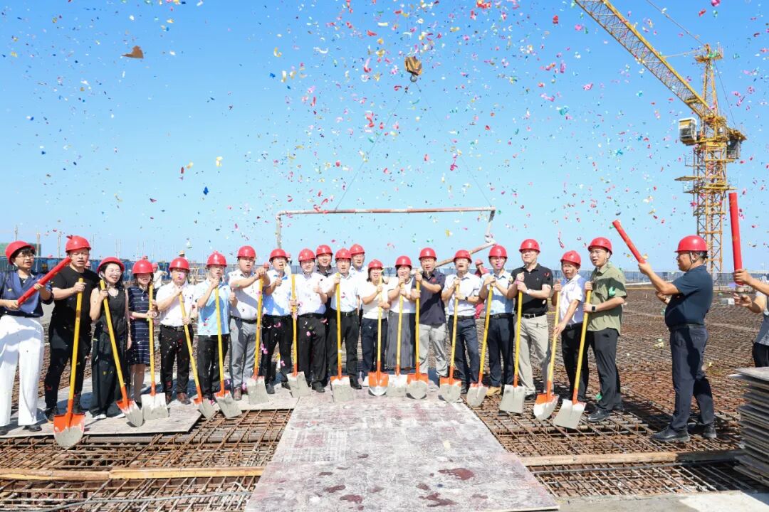 8:58,随着董事长赵兴雷一声令下,封顶仪式正式拉开帷幕,管理人员手持铁锹,齐心协力填补最后一铲水泥,共同完成了这一具有纪念意义的时刻。水泥填补完成的瞬间,礼炮齐鸣,彩带纷飞,现场气氛达到了高潮。